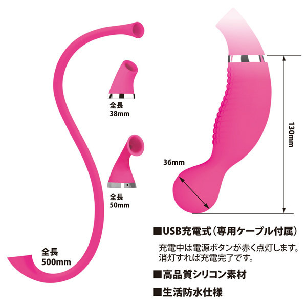 パッケージ:30.0×11.8×5.3cm 本体:挿入部13.0×3.6cm・アタッチメント小全長3.8cm・アタッチメント中全長5.0cm・アタッチメント大全長50.0cm セット内容:バイブ本体、吸引ホース×3種、充電ケーブル USB充電式