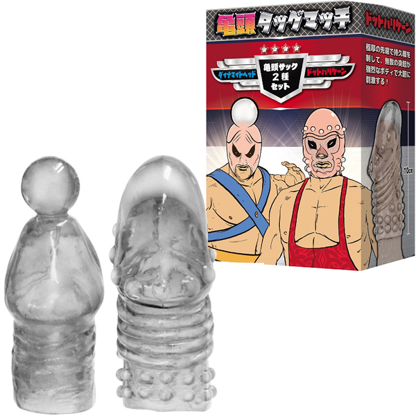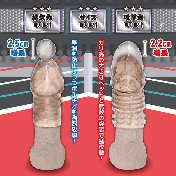 サックを被せるだけでいつものプレイを一層刺激的にするのが「モンスターサック」ですが、こちらも同様にスポッと亀頭へ被せるだけで、いつもと異なる快感を味わえるペニスサック2個セット。亀頭の先端が球状になったものと、無数の突起がついたカリ高をサイズUPさせるものと、一個で2種の刺激が楽しめる!ペニスの持久力UPでお悩みの方や、もっと彼女を気持ち良くしたい方、そのほかカップルや夫婦のマンネリ解消にも♪