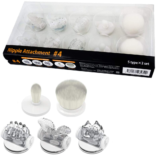 ニップルアタッチメント系の商品のなかでも未知の快感と高クオリティな乳首ローターとしての機能が楽しめると評判のニップルドーム用アタッチメント。こちらのアタッチメント4はニップルファン待望の回転&バイブ機能が搭載!お肌に優しいソフトな弾力の柔らかブラシによるバラエティ豊かな快感と気持ちよさ。乳首開発の起承転結にて最終章とも呼ぶべき堂々のクライマックスとなる本商品!ニップルドーム・カップシリーズの交換用として末永く重宝できる絶頂構造ニップルグッズです。マイクロローター搭載で振動するアタッチメントが3種類。乳首を刺激するのに適したブラシアタッチメントの2種類がセットとなっています。ご使用には別売りの本体(ニップルドーム)が必要です。アタッチメントの商品単体ではご使用いただけませんのでご注意ください。