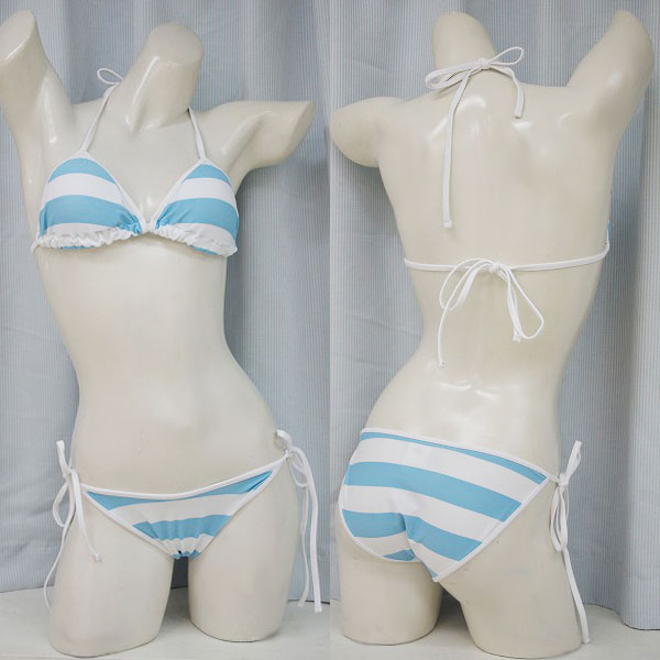 パステルカラーで萌え感たっぷり!サックス×ホワイトのボーダー柄ビキニセットが登場しました。太めのしま模様がとってもラブリー!ホルターネックの三角ビキニはブラパット付き、ショーツのサイドリボンは取り外しが可能な紐パン仕様です。キュートなしましま水着でビーチやプールへGO!※水洗い可、塩素系漂白剤による漂白不可、アイロンは中温で当て布使用、ドライクリーニング可※こちらの商品は在庫の状況によりお届けまでに4日〜7日程度かかる場合がございます。