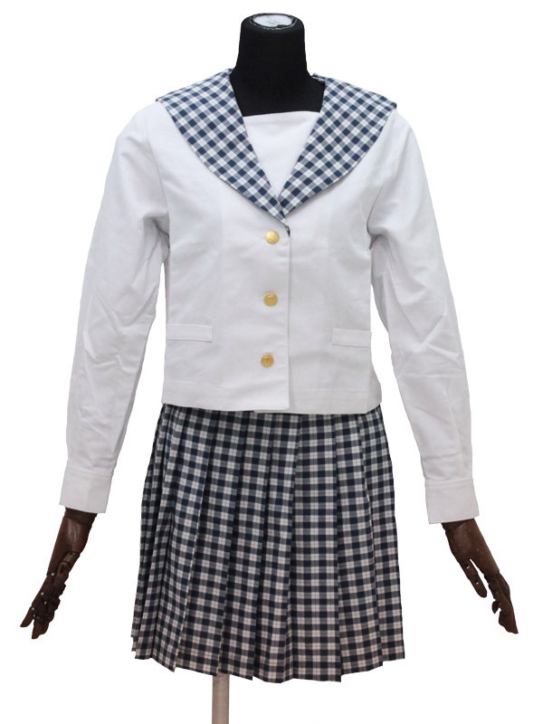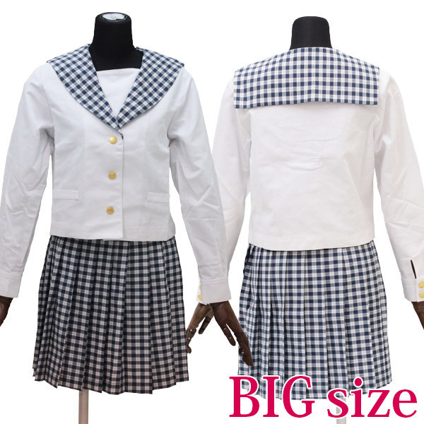 フロントと袖口の金ボタンがポイント!紺色ギンガムチェックのセーラー服コスプレ。●オールシーズン対応可能な長袖の中間服●短め丈のセーラーブラウスは前開きボタン仕様●胸当てはスナップボタンで取り外し可●プリーツスカートのウエストはアジャスター調整式●大きいさんも着られるBIGサイズ。お嬢様学校風にとことん可愛らしく仕上げた制服コスチュームです。※水洗い不可、塩素系漂白剤による漂白不可、アイロンは中温で当て布使用、ドライクリーニング可、色落ちの可能性があります、ご注意ください。※こちらの商品は在庫の状況によりお届けまでに4日〜7日程度かかる場合がございます。