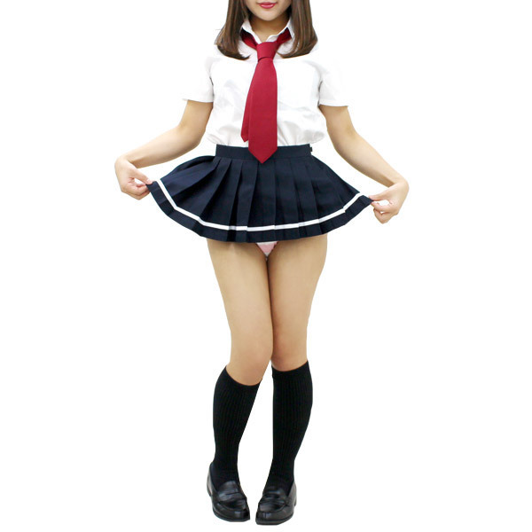 超ミニ無地プリーツスカート単品 紺×白ライン M