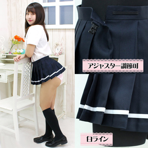> 超ミニ無地プリーツスカート単品 紺×白ライン M