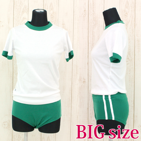 BIGサイズ B96〜110cm・W〜90cm(伸縮時最大114cm)・H〜100cm 上衣:着丈58cm・肩幅39cm・袖丈21cm ブルマ:股上丈32cm セット内容:上衣、ブルマ 素材:ポリエステル65%、コットン35%