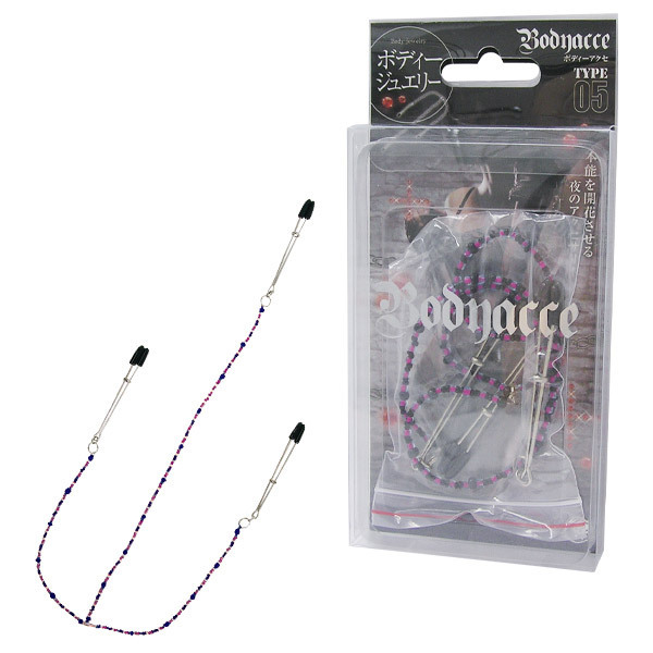 Mの敏感な場所をつまみ上げ、身体を美しく彩る装飾ボディークリップです。クリップのリングをスライドさせ、挟む幅を調整して両乳首&クリトリスに装着。それらをキラキラした黒と紫のビーズアクセサリーでY字に繋ぎとめた、ファッショナブルでセクシーな3点責めSMグッズです。性感帯を刺激するクリップ先端は、ゴムで保護してあるので安心して使えます。
