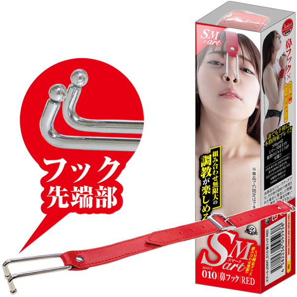 クイッとひっかければ、かわいい顔も華麗に変形!豚鼻が簡単にできるSMグッズ。ジョイント式拘束具シリーズより、顔面調教には欠かせない鼻フック(赤)が出ました。ベルトは合皮、金属部分の先端は傷つけにくい球になっているので安心です。鼻フックに別売りの首枷を追加すれば、吊り上げ固定も可能!醜く崩れた恥辱変顔フェチにはたまらない拘束グッズです。