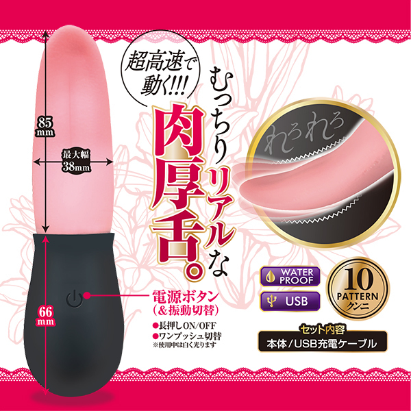 激しい愛撫で乱れちゃう。下品で卑猥なお手軽クンニローター!超高速で動く、むっちりリアルな肉厚舌。舌部分はエラストマー製のむっちりな触り心地。超柔らか素材だから強く押し当てても大丈夫。クリにも乳首にも、柔らかいから中にも使えます。使い方はプレイに集中できるワンボタンで、USB充電式。防水仕様だから、使用後も洗えて清潔で安心。激しく濃厚なクンニは全部で10パターン。焦らず、リズムよく、激しく、そして優しく…。日常のすべてを忘れ、ぐっしょりとクンニ時間に溺れてください。充電時間:約120分連続使用時間:約60分(使用状況や環境により時間が変わる場合があります)。・10パターンアクション・USB充電・防水仕様