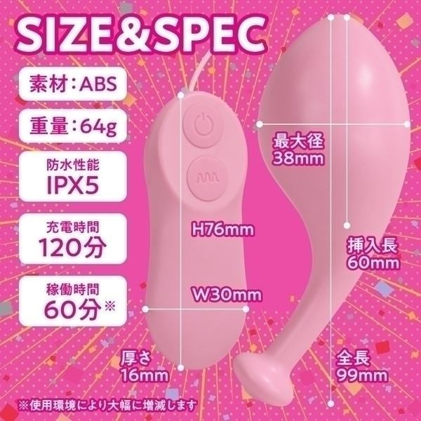 本体サイズ:コントローラー:3.0×7.6×1.6cm ローター:全長9.9cm×挿入長6.0cm 最大径3.8cm 重量:64g USB充電ケーブル USB充電式
