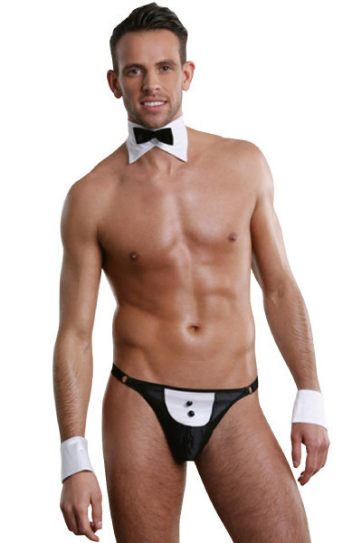 ランジェリーでもフォーマル気分!オシャレ度がグンとUPするメンズ用下着セット。●黒×白のシックなバイカラー仕様●タキシードデザインのGストリング●蝶ネクタイが可愛いアクセントに●付け襟・付けカフスもセット。おもてなしやエスコートはおまかせあれ!インナーなのにフォーマルな雰囲気が演出できる男性用ランジェリー。特別な夜や記念日などにぜひどうぞ。