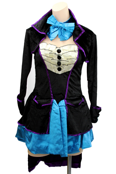 異素材コンビで大人の雰囲気に♪セクシークールなマジシャン風のコスプレ衣装。パープルカラーのパイピングを差し色にした黒ベロア素材と、光沢ブルーサテンの異素材で仕上げたベアトップデザインのミニワンピース!胸元は4段フリルで飾って可愛らしさもしっかり!スカート後ろのテール部分は縫い付けです。ワンピとお揃いベロア素材のミニ丈ボレロは、カフス付きの長袖仕様!サテンのマジシャンハットとビッグなリボンもセットです。※セット内容以外は付属しておりません。