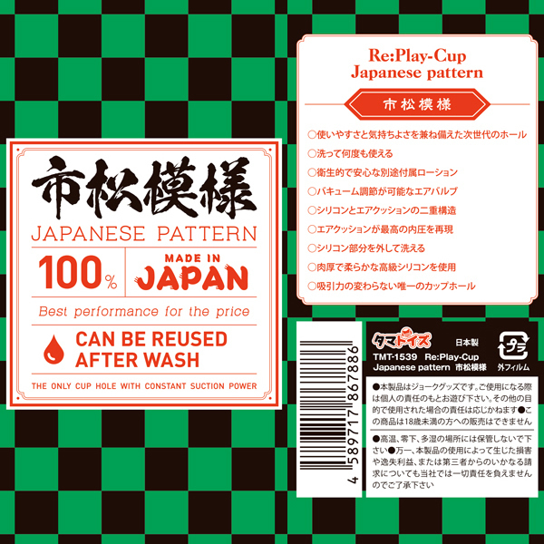 話題性のある「柄」をモチーフにしたパッケージデザイン!使い勝手と気持ちよさを兼ね備えたリプレイカップジャパニーズパターンです。こちらは市松模様♪洗って何度も使えるというのがウリで、繰り返して使用することが可能。オナカップなので手のベタつきも防げますし、バキューム調整が可能なエアバルブ式で使用感も抜群!シリコンとエアクッションが二重構造になっていて、エアクッションにより最高の内圧を再現♪肉厚で柔らかな高級シリコンを使用した吸引力の変わらないカップホールとなっております。ローションが別途添付されています。●メーカー型番:TMT-1539 ●メーカー型番:TMT-1539