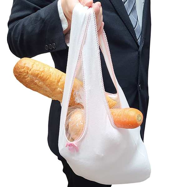 パンティ片手に街を練り歩く!?誰かとすれ違いざまに思わずドキッとさせてしまう「なんだかパンティっぽい見た目」が特徴のジョーク系グッズ「パンティエコバッグ」です。小さいリボンの装飾がそれっぽく、股間部分はクロッチになっているのもポイントです♪ジョークグッズとしてプレゼントやイベントの景品としてもどうぞ。