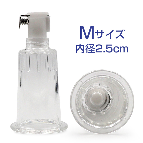 イージーサクションポンプ専用シリンダーのMサイズです。こちらのMサイズは内径が2.5cmです。イージーサンクションポンプの本体にこちらの専用シリンダーを付け替えることで意図した箇所をピンポイントで吸引できます。サイズ:7.5cm×3.9cm内径:2.5cm。スタンダードにお使いいただけるサイズとなっています。