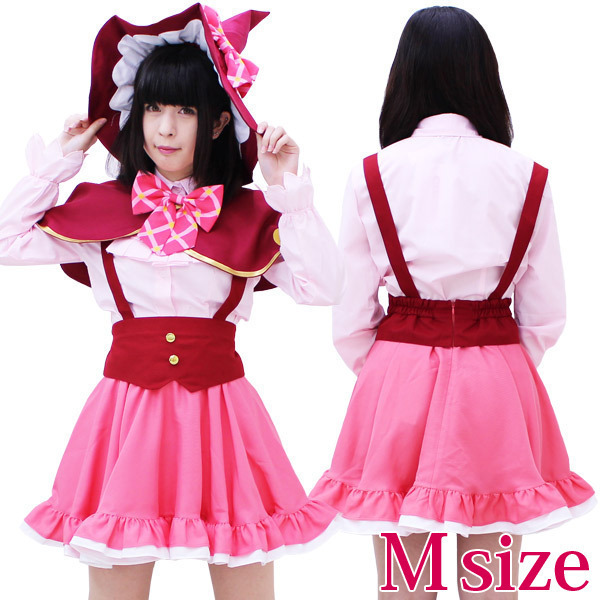 Mサイズ:B〜90cm・W58〜72cm ブラウス(肩幅39cm、袖丈57〜60cm、着丈58cm、首回り36cm) スカート(丈46cm、肩紐58〜65cm) 帽子:頭囲62cm セット内容:ブラウス(前ボタン・袖口ゴム)、フリルタイ、リボン、肩紐付きスカート、ケープ(前スナップボタン留め)、リボン付き帽子(リボン固定用のスナップボタン付)