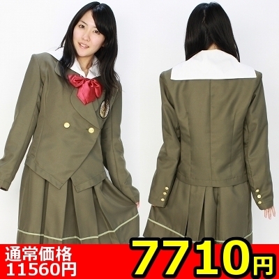 カーキカラーが可愛い!お嬢様系制服コスチューム。ジャケットの胸元には、しっかりとした刺繍製のワッペン入り!カーキ色が赤いリボンを際立たせます!セーラー襟のシャツや、スカートに入ったラインもオシャレな制服コスプレ衣装です