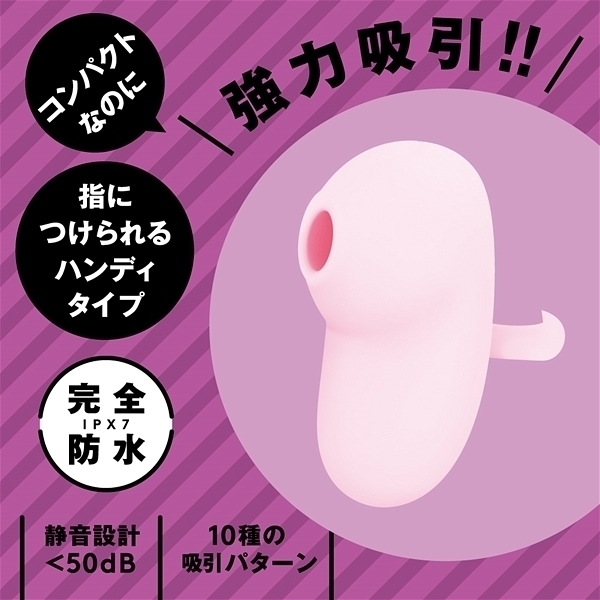 史上最強吸引ローター!指につけられるハンディタイプの吸引ローター!コンパクトなのにめっちゃ強力!優しいチュパチュパから激しいジュポジュポまで豊富な10種の吸引パターン!指につけられて手にフィットする形状だから使い心地もバツグン!完全防水だから使用後のお手入れもラクラクです!欲しいトコロ全部入ってる史上最強吸引ローターで絶対クリイキ宣言!敏感な部分に直接使うものだから押し当てても痛くない柔らかマット素材を使用しました。吸引:10パターン&完全防水IPX7等級&静音設計<50dB&充電用USBケーブル付属。●カラー:ピンク