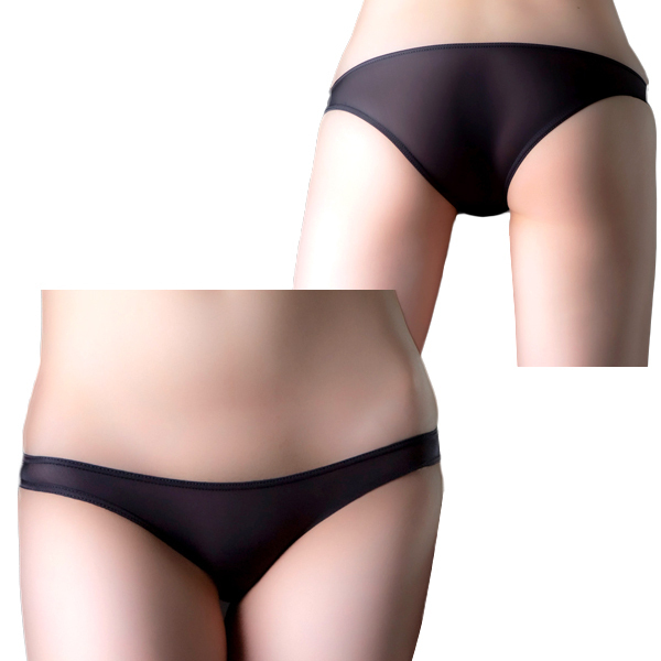 黒の微透感が大人っぽい!日本国内の工場で縫製され、肌触りが良く伸縮性と透明性の高い国産のストレッチ生地を使ったハーフバックショーツ。クロッチ部分に縫い目のないハギ無しタイプでお肌がデリケートな方でも安心。