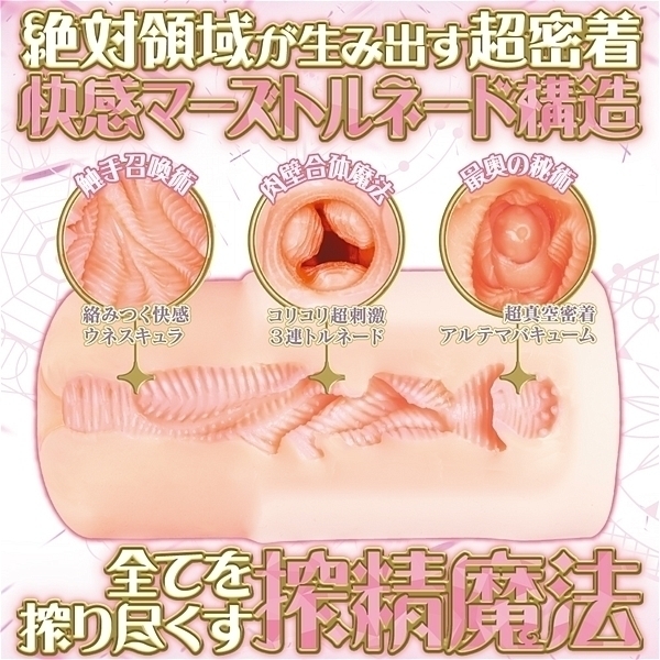 奇跡の自立式2層構造!「絶対領域リトルウィッチーズマーズ」は自立式アウター2層構造ギミックのスタンドアップオナホールです。上部をやわらかい「柔肌ソフトインナー」成型し、底部を締め付け感抜群の「硬質ハードアウター」で包み込むことで、プレイ中に「直接立てて置ける」為、ローション漏れを防止し、使いやすさを追求しました。また「硬質ハードアウター」はがっちりとした硬質素材を採用することでベタつきや油染み、不快な匂いを極限までカットしました。ニーソックスのような「アウター2層構造」の絶対領域は完璧な柔硬バランスにより生まれる「アルテマバキューム」で快感を逃さない「超密着」を実現しました!そんな「見習い魔女のマーズ」の内部はトルネード構造になっており、挿入感もマーヴェラス。挿入口からいきなり強力な「肉壁合体魔法3連トルネード」が発生し、コリコリと全方向から小気味よく絡みつきます。奥へ進むと更に広範囲に「触手群ウネスキュラ」が展開!ランダムに撫で上げる触手ヒダがより一層射●感を高めます。最奥の秘術「アルテマバキューム」は全てを吸い込む魅惑の秘術、超密着による圧倒的吸引力が楽しめます。全てを搾り尽くす搾性魔法を思う存分お楽しみください。保管に便利な専用ブリスターケース、オリジナルローション付属。